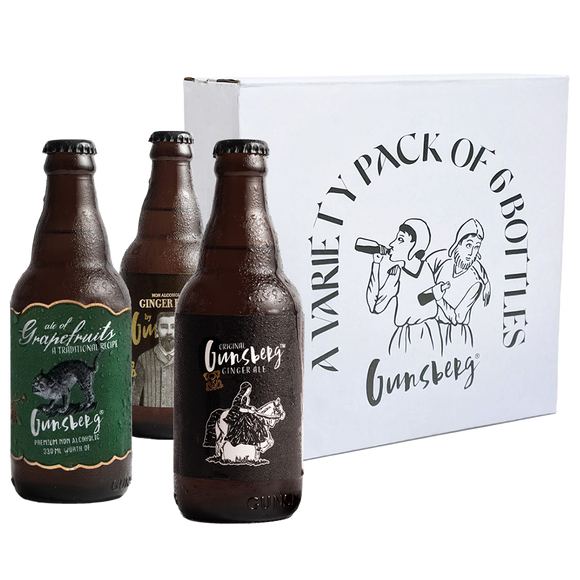 An amalgamation of our three premium non-alcoholic beverages. Each variety pack comes with 2 bottles of Gunsberg Ginger Ale, 2 bottles of Gunsberg Ginger Beer & 2 bottles of Gunsberg Grapefruits Ale.
